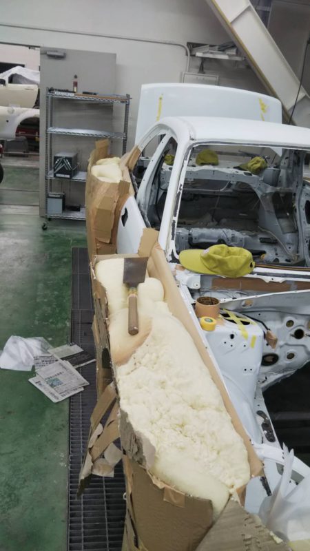形が大体決まり、受けを作って発泡ウレタンを流し込みます。もこもこした発泡ウレタンをカッターなどで大まかに切り落としてそこからやすりで形を整えていきます!
