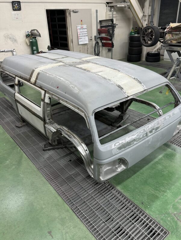 チョップトップと呼ばれるルーフを低くするカスタムとそれと同時に横幅を広げる加工をしました。