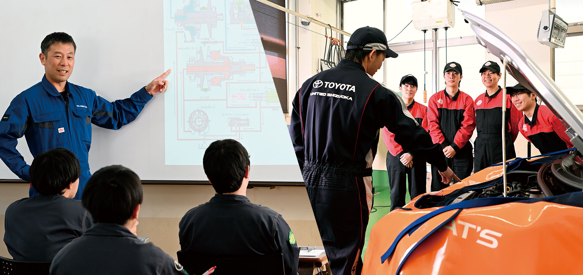 自動車ディーラーのトップエンジニアが受け持つ実習授業では、整備の現場の「今」を知ることができ、自動車技術の進化と共に新しい知識と技術を学びます。現場の最前線で活躍しているトップエンジニアだからこそ現場で求められるものを知っています。